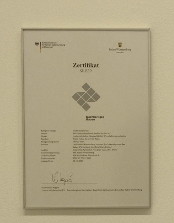 Das Fakultätsgebäude Waldcampus in Aalen hat die silberne BNB-Plakette für nachhaltiges Bauen erhalten.