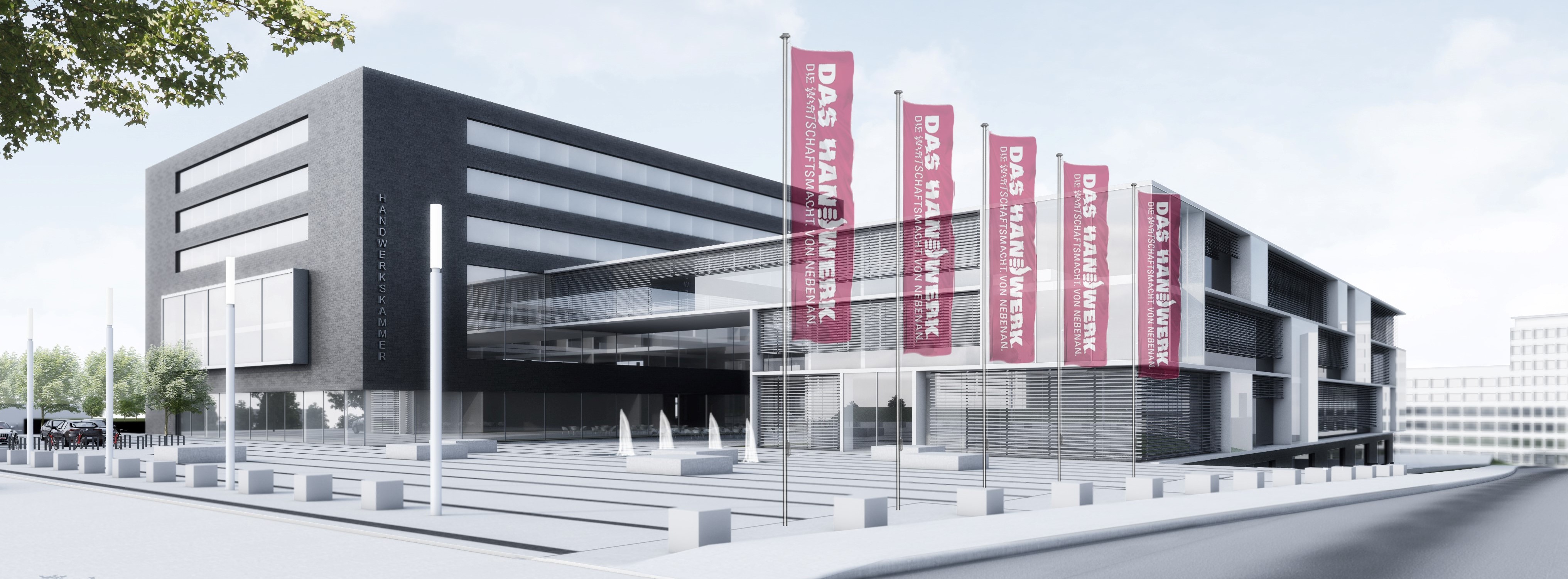Das Gebäude besteht des weiteren aus großflächigen Bürobereichen für die Mitarbeiter der Handwerkskammer Ostwestfalen-Lippe zu Bielefeld und eine Ebene mit Gästezimmern