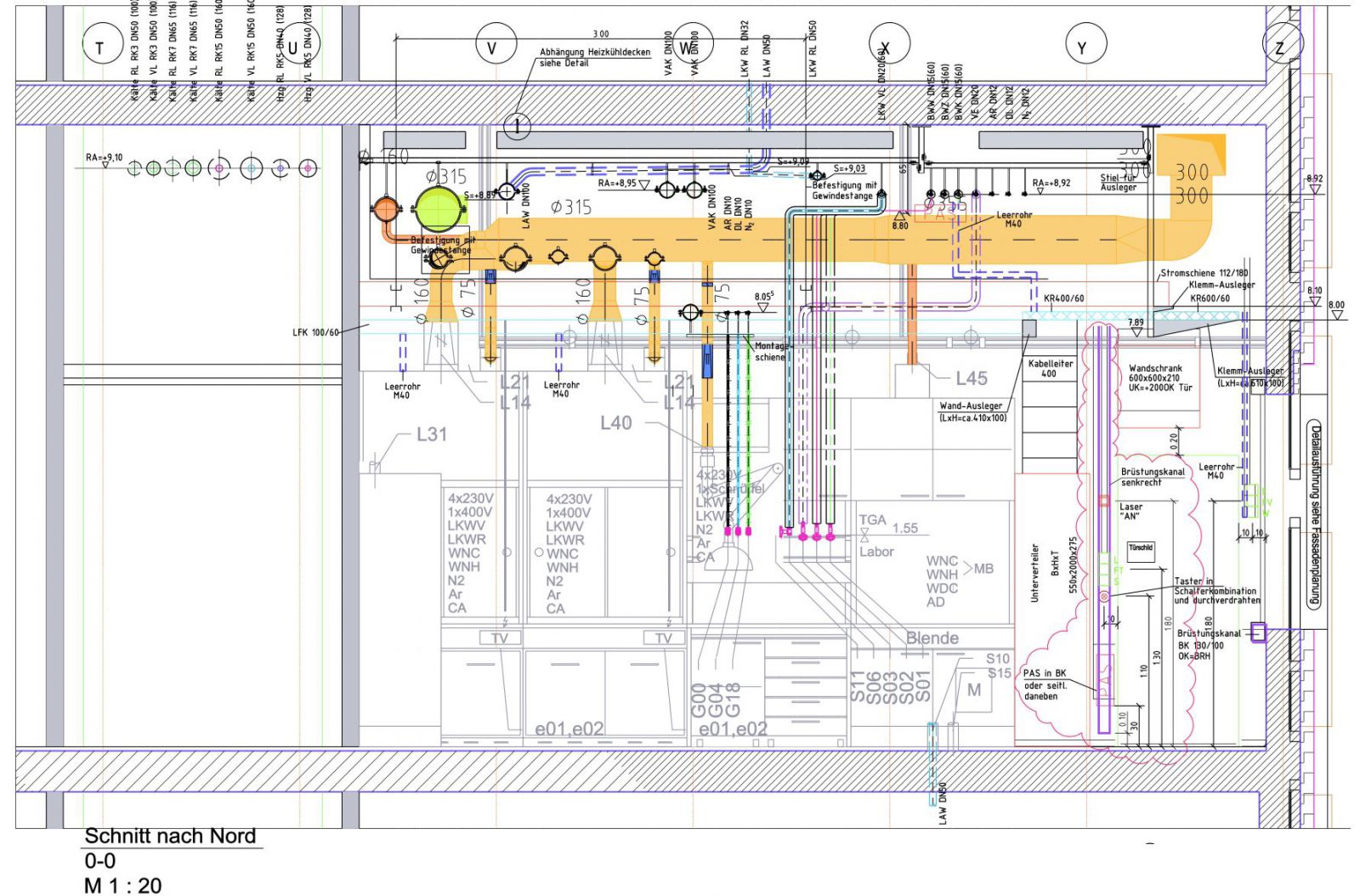 Die Be- und Entlüftung der Laborbereiche erfolgt über teilredundante Lüftiungsanlagen (2x60%) Aufgrund der Forschungsarbeiten kann die Verwendung von Chemikalien nicht eingegrenzt werden. Daher ist die Abluftinstallation komplett in Kunststoff ausgeführt. Lediglich die heiße unbelastete Abluft (zB. Laserabluft) ist in Edelstahl ausgeführt. Erhöhte Aufwendungen für Schallschutz für den Aufstellraum des Elektronenrastermikroskops.